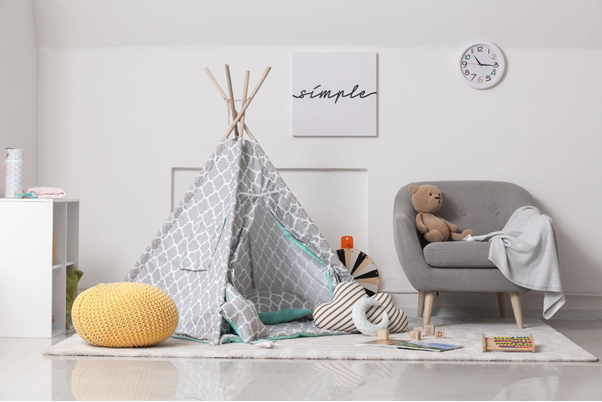 When designing a kids’ room, it’s important to prioritize play space. Take safety measures by laying soft mats on the floor to prevent injuries if they fall.