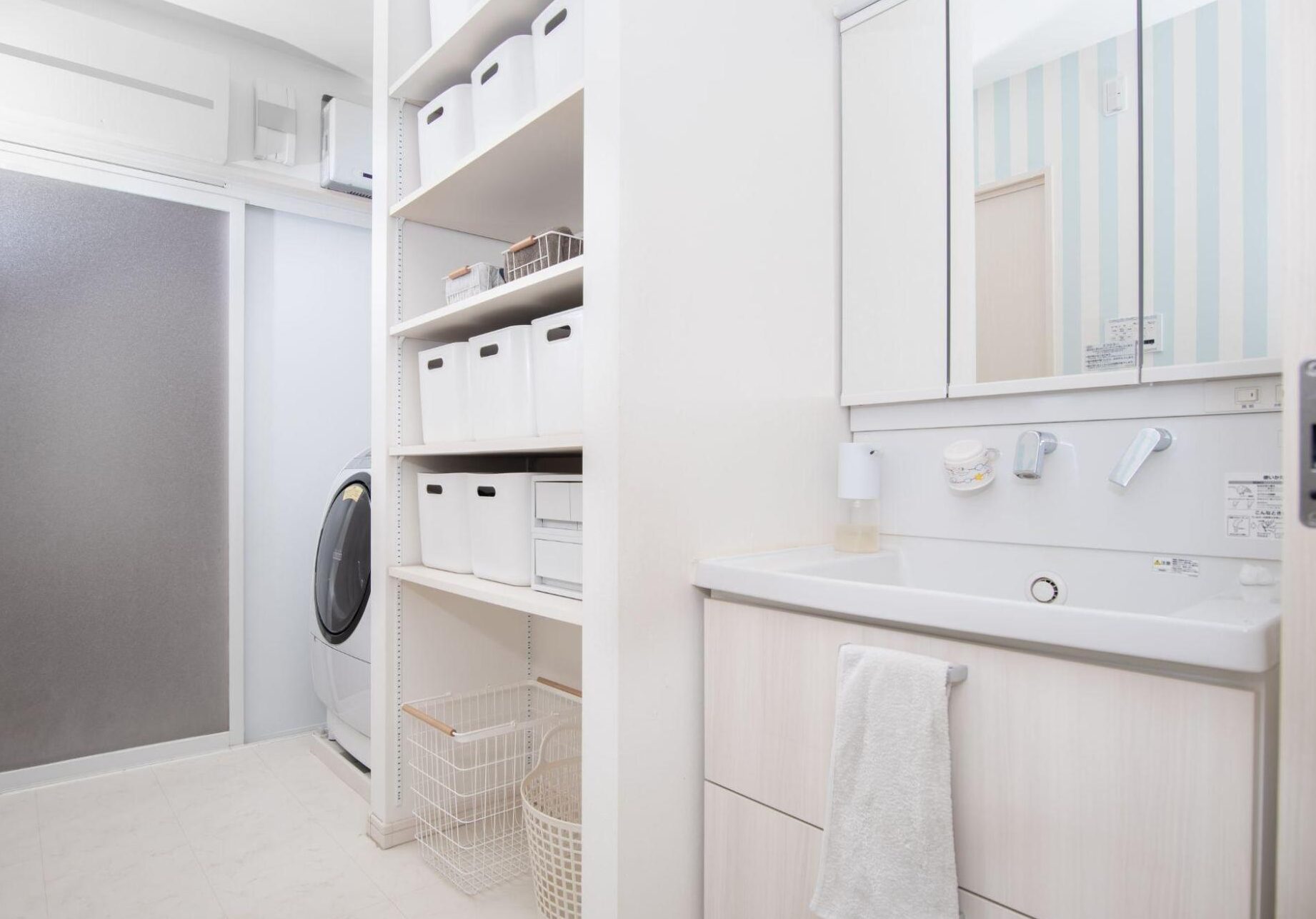 If space permits, designate a corner with a folding table or countertop for sorting and folding clothes. Conceal the laundry area with a shoji screen or curtains to maintain a seamless look within the room.