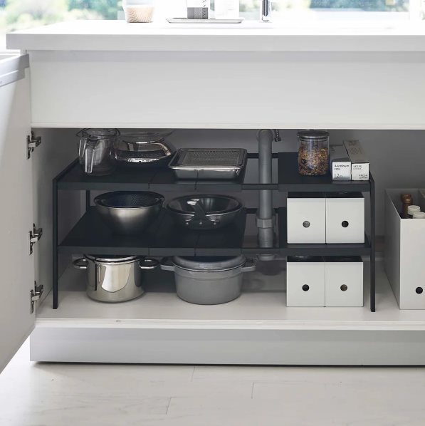 However, if there are pipes and therefore it is difficult to use book stands or dividers, using dedicated shelves designed for under-sink storage can provide a tidy solution. Dedicated storage shelves are unique for their adjustable height and spacing, hence enhancing usability.