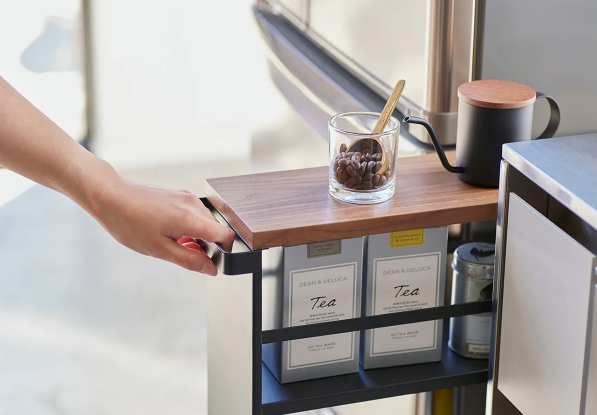 The movable slim cart fits neatly into narrow spaces such as between the refrigerator and the sink, and by using the handle you can pull it out only when needed.