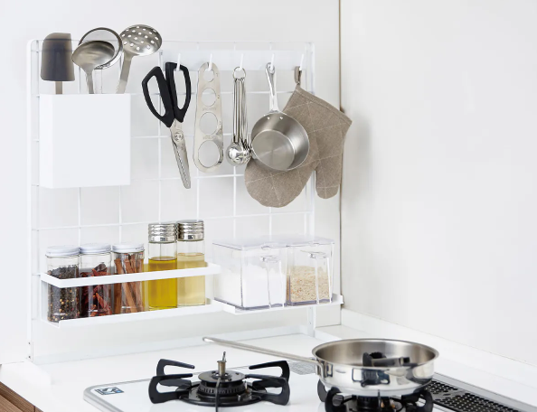 Additionally, you can install a spice rack on the wire net by attaching small baskets to store seasoning bottles and spice jars.