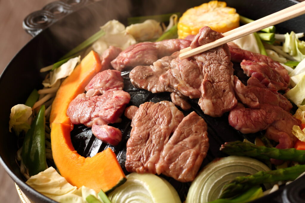 Jingisukan, a barbecued lamb dish also called “Genghis Khan”, is a quintessential Hokkaido meal. Although lamb, or mutton, isn’t widely eaten across the central and southern parts of Japan, it is eaten a lot across Hokkaido.
