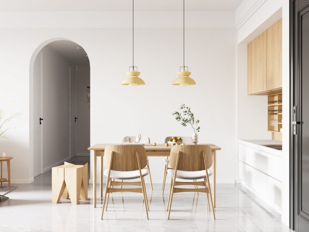 Para iluminação na sala de jantar, luminárias suspensas penduradas no teto são uma ótima escolha. As luminárias suspensas servem como um destaque elegante para o interior e, quando iluminam efetivamente a área acima da mesa, criam um efeito tridimensional no espaço, melhorando ainda mais a atmosfera da mesa de jantar.
