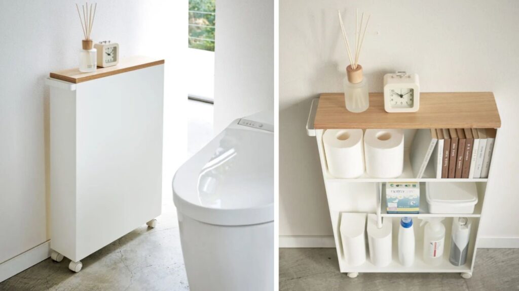 O uso de um rack fino e funcional para armazenar papel higiênico e materiais de limpeza é uma ótima opção. Em um banheiro com espaço limitado, um rack fino é ideal porque não ocupa muito espaço. Além disso, como o tampo é uma mesa, você pode colocar purificadores de ar e desodorizantes ou usá-lo para exibir itens decorativos para conquistar mais pontos em estilo.