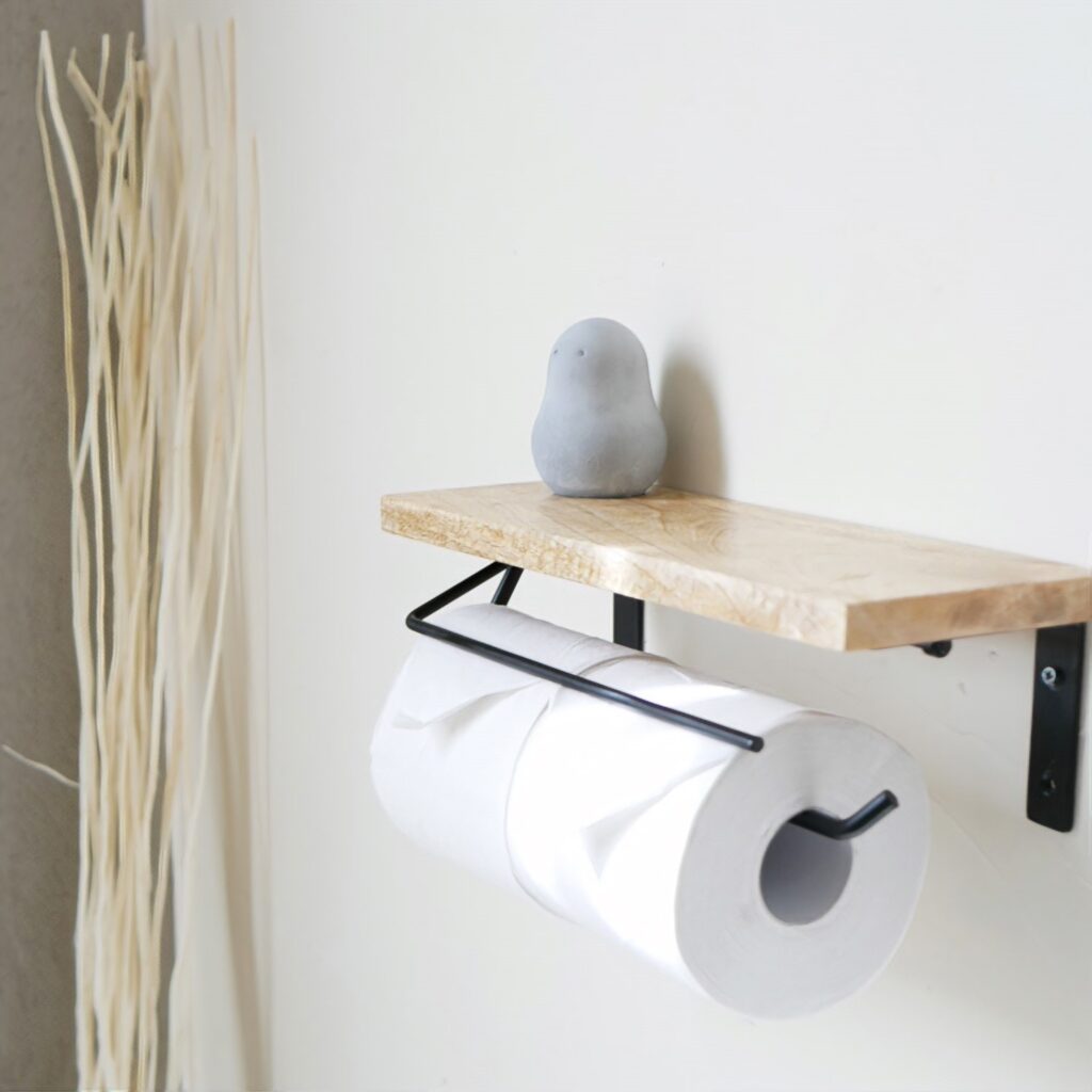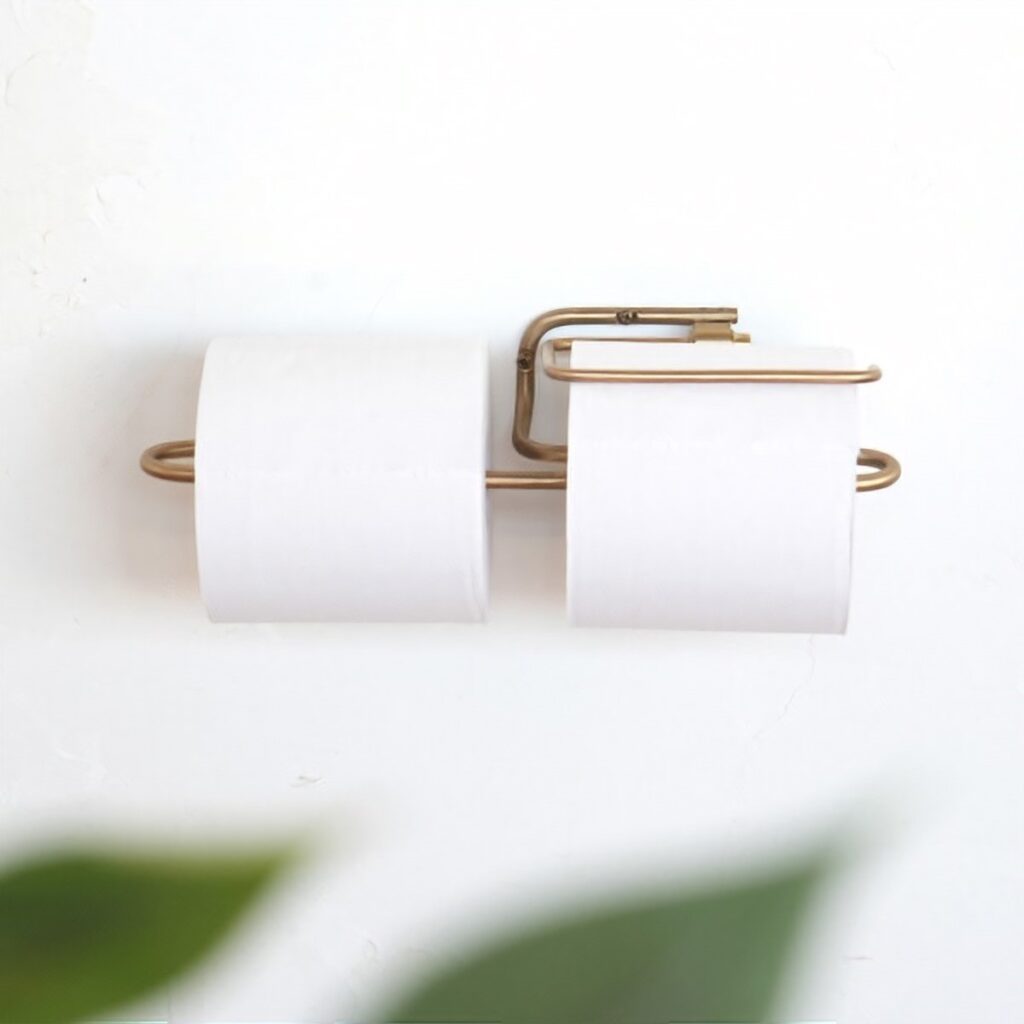 Um suporte de papel higiênico com uma prateleira na parte superior não só fornece um local para itens decorativos como também adiciona um toque natural ao ambiente. Suportes feitos de ferro ou latão com um design simples e refinado podem transformar o espaço em algo mais sofisticado.