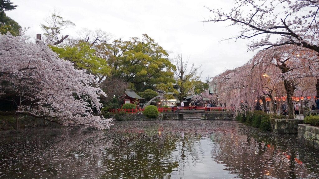 Mishima Taisha é um santuário histórico cercado por uma vegetação exuberante e árvores de flores de cerejeiras. Você pode admirar a Sakura rosa suave em plena floração dando um passeio pelos jardins do santuário. O contraste das pétalas cor de rosa com a arquitetura tradicional do santuário cria um cenário de beleza atemporal.