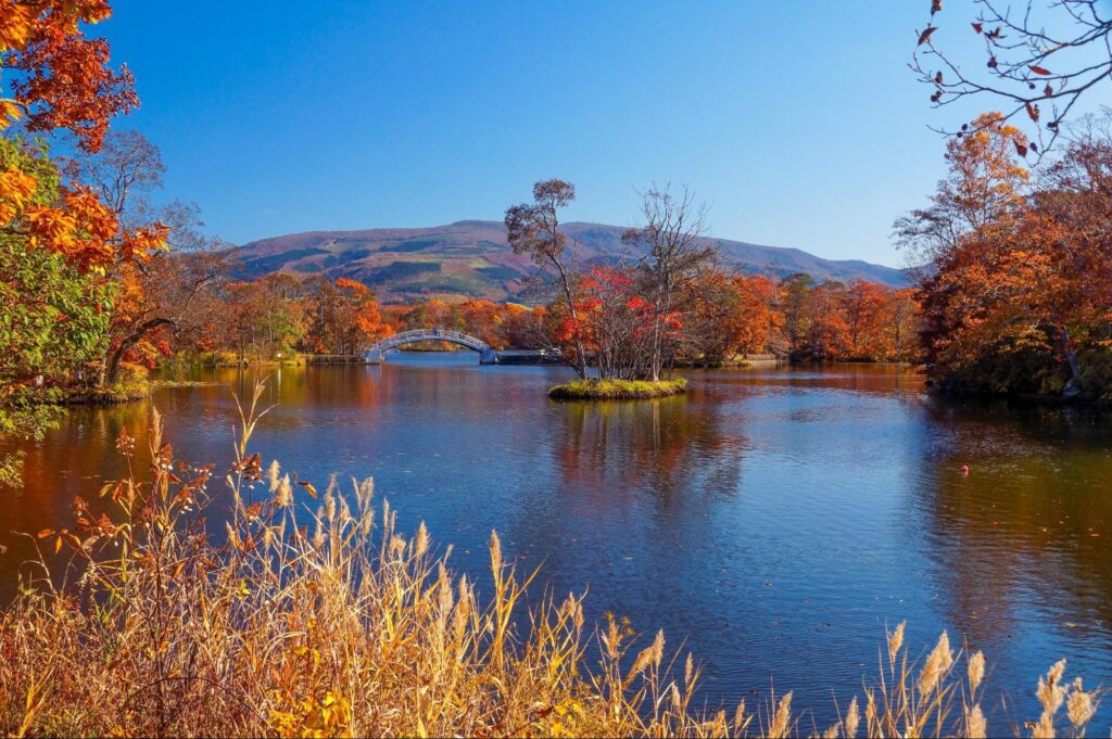 As folhas de outono vibrantes são refletidas na superfície do lago, criando um caleidoscópio de cores. Não deixe de passar por algumas das dezoito pontes que atravessam até algumas das pequenas ilhas do Lago Onuma. O Monte Komagatake, um vulcão ativo, é um dos pontos turísticos mais impressionantes do Parque Nacional Onuma Quasi.