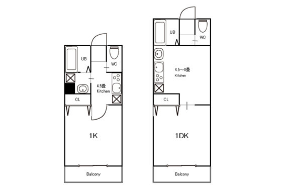 Um espaço de cozinha de um apartamento 1K tem menos de 4,5 tatames de tamanho, enquanto um espaço de cozinha 1DK tem entre 4,5 tatames e 8 tatames de tamanho. Além disso, muitos apartamentos 1DK tendem a ser mais antigos e, com condições econômicas mais vantajosas, você poderá encontrar imóveis com aluguéis semelhantes aos das unidades 1K.