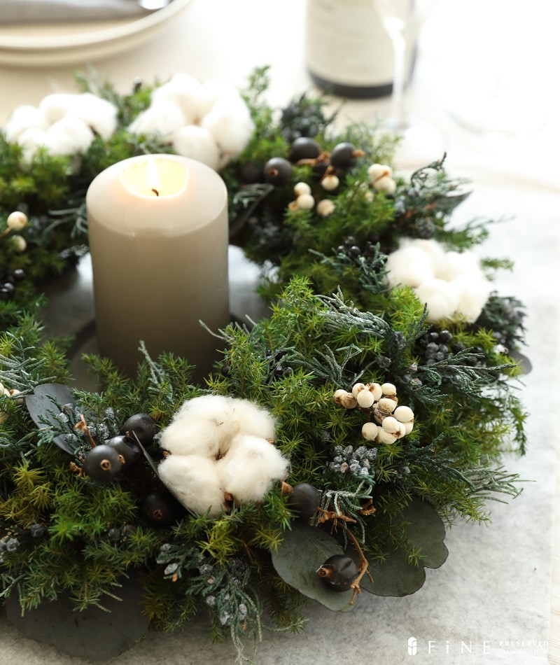 Chiếc vòng hoa này gây ấn tượng với tông màu xanh tươi mát làm nền, được điểm xuyết bởi quả mọng xanh thẫm và những bông hoa bông gòn mềm mại. Đây thực sự là một phong cách trang trí tường đầy tinh tế, là lựa chọn lý tưởng để tạo nên không gian ngập tràn không khí Giáng Sinh.