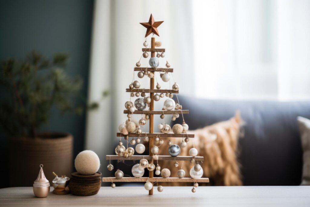 Một cây thông Giáng sinh gỗ, được trang trí bằng đồ trang trí giấy làm thủ công vừa dễ làm lại vừa tạo ra một không khí ấm áp. Để tăng thêm bầu không khí ấm cúng, bạn có thể treo dây đèn giăng qua những món đồ nội thất gỗ.