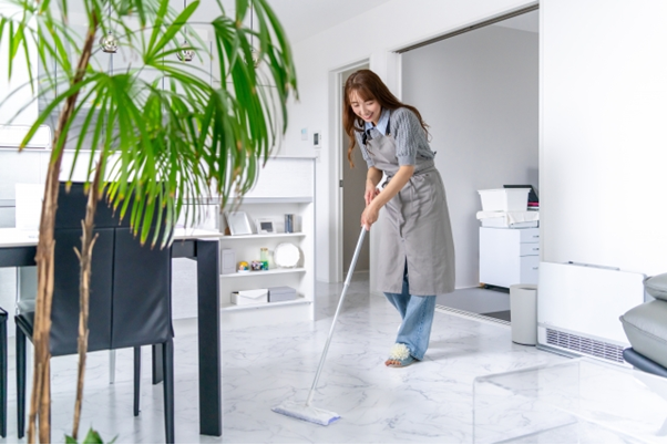 Dùng cây lau nhà có khăn ẩm hoặc khăn lau ướt tiện lợi – sau khi lau xong, chỉ cần vứt đi mà không mất công giặt lại.