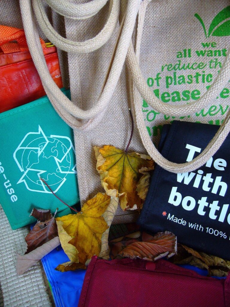 Nếu đi mua sắm, hãy mang theo túi tote có thể tái sử dụng và túi đựng đồ của riêng bạn đến trung tâm thương mại, chợ hoặc tiệm tạp hóa để đựng hàng hóa. Nếu hay quên, hãy luôn dự trữ sẵn một chiếc túi trong túi xách, xe hơi, túi áo khoác, v.v…