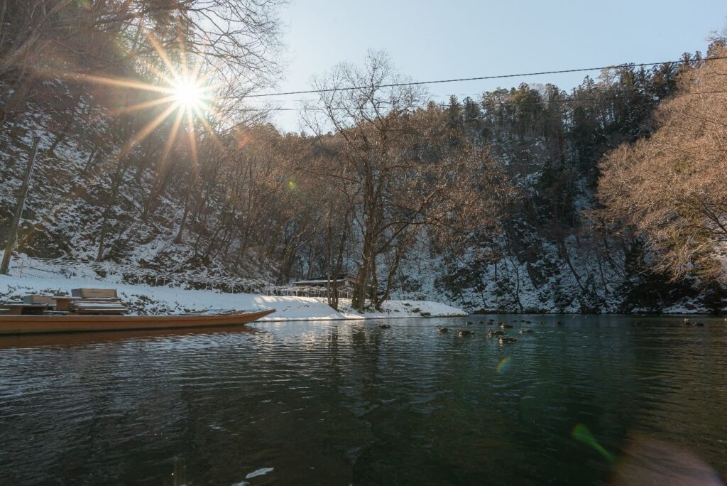 Một nét đặc biệt của Geibikei vào mùa đông là những chiếc thuyền được trang bị kotatsu, loại bàn sưởi thấp truyền thống Nhật Bản, phủ chăn dày để giữ ấm cho hành khách. Ngoài ra, bạn còn có thể lựa chọn thưởng thức món kinagashinabe – món lẩu đặc sản của vùng, vốn là món ăn phổ biến của các tiều phu vào mùa đông. Món lẩu này là sự kết hợp giữa các loại rau củ, thảo mộc núi, thịt gà và thịt heo, tất cả được hầm cùng với miso, tạo nên hương vị đậm đà và ấm lòng giữa tiết trời lạnh giá.