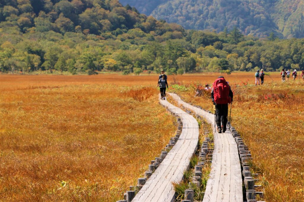Ozegahara, hay còn gọi là Đầm lầy Oze, là khu đi bộ đường dài độc đáo ở Vườn quốc gia Oze ở tỉnh Fukushima. Nơi đây là điểm đến tuyệt đẹp ở Fukushima khi cỏ chuyển sang màu đỏ và màu vàng vào mùa thu. Ở đây có nhiều cung đường hiking khác nhau, thích hợp với những người đi bộ đường dài ở mọi cấp độ, từ cung đường đi nhiều ngày hay những cung đường ngắn dễ đi.